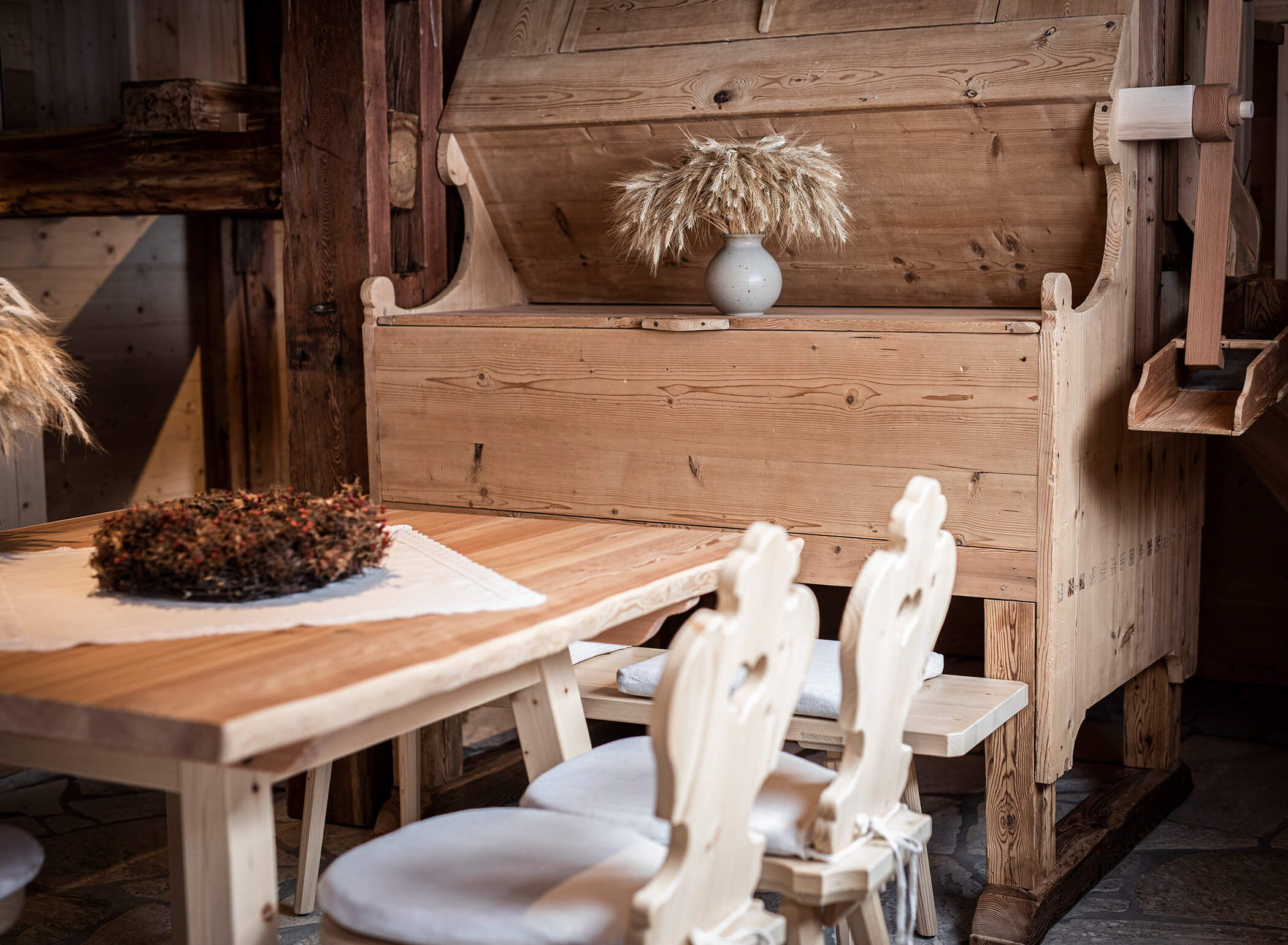 Surrounded by meadows and forests, nestled in the charming mountain landscape of the Antholz Valley, this rural gem tells stories of bygone days. We took the bold step to give a technical cultural heritage a new purpose. The Burgfrieder Mühle has been restored and reimagined to offer guests the luxury of a truly secluded vacation.