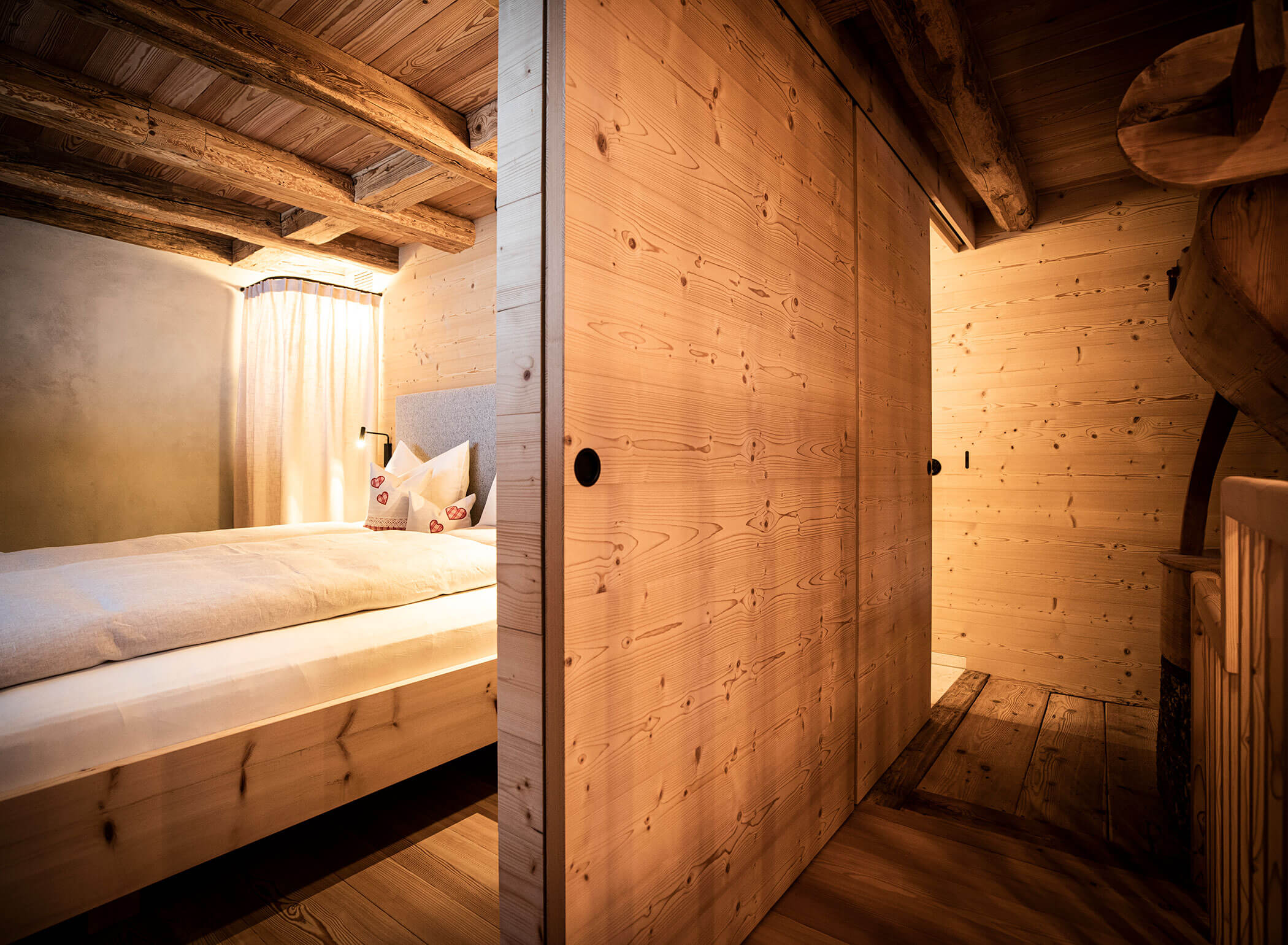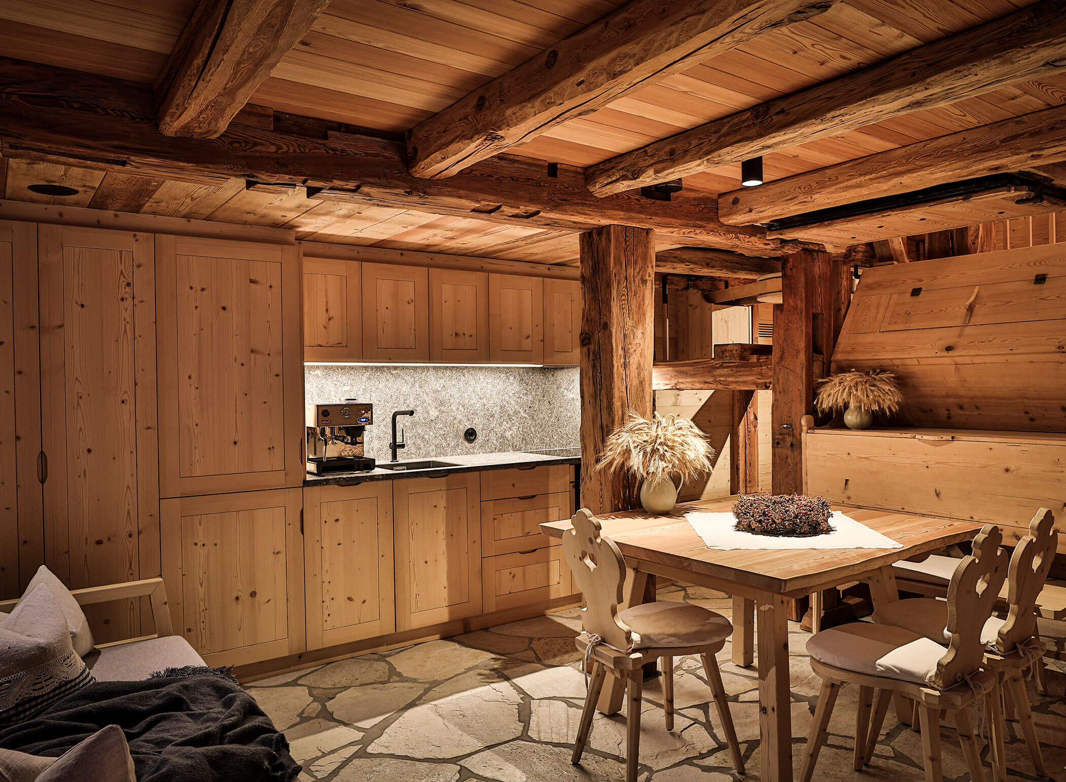 Finally vacation – finally unwind and disconnect. A new, unique private escape, situated in a quiet hollow in Rasen, in the Antholz Valley, where authenticity and luxury form a promising symbiosis. An exclusive retreat in the form of a lodge in the South Tyrolean Puster Valley – a former farm mill, expertly restored and exquisitely furnished.