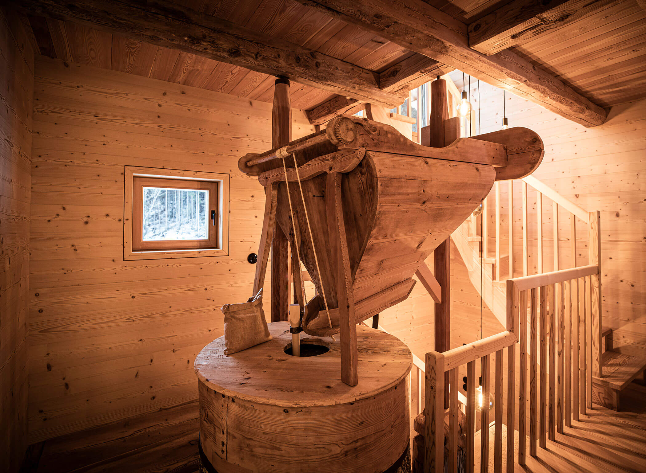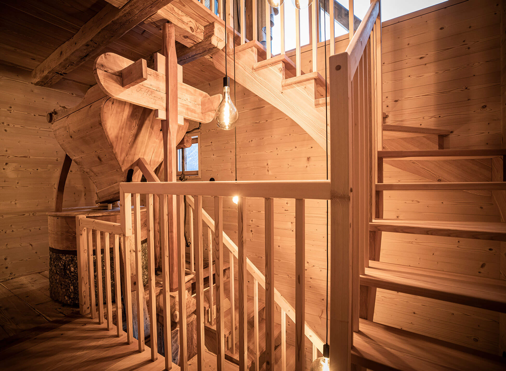 Restored and (still fully functional, though now for display only): the mill is at the center of everything. Around it, a high-quality apartment unfolds over three individually designed levels, furnished with premium materials.